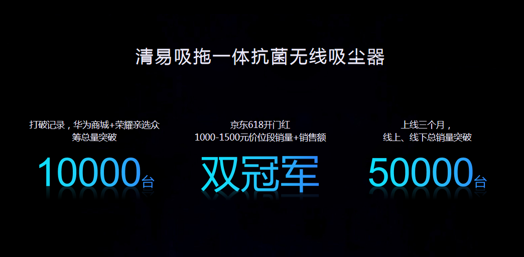 华为也是如此,在今年4月份的时候,华为荣耀推出了自己的吸尘器品牌——清易,这款吸尘器作为荣耀首款吸尘器,可谓是大放异彩,不仅在预售期间斩获10000台预定,一举打破了吸尘器行业记录。而且在上线3个月内,销量突破50000台!
